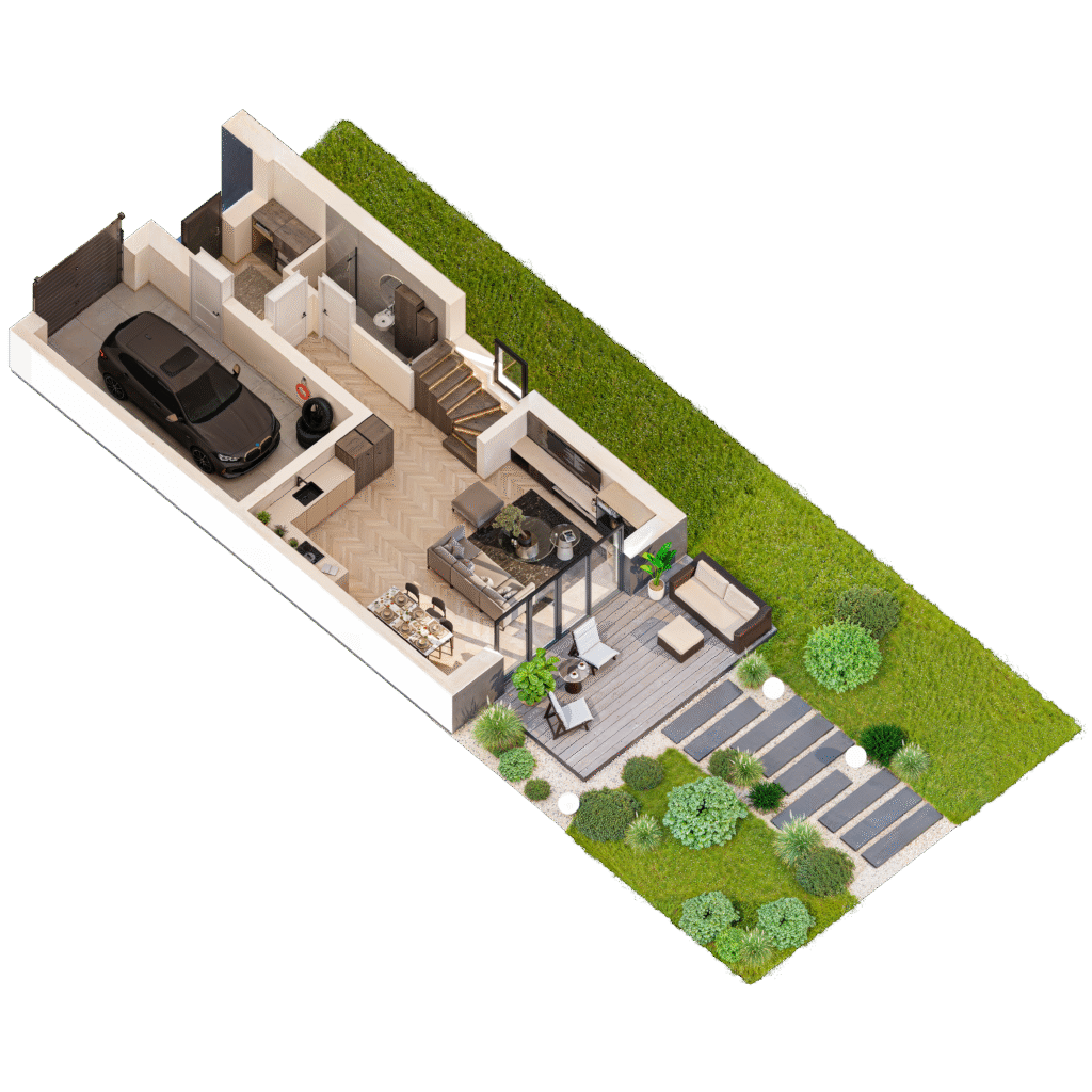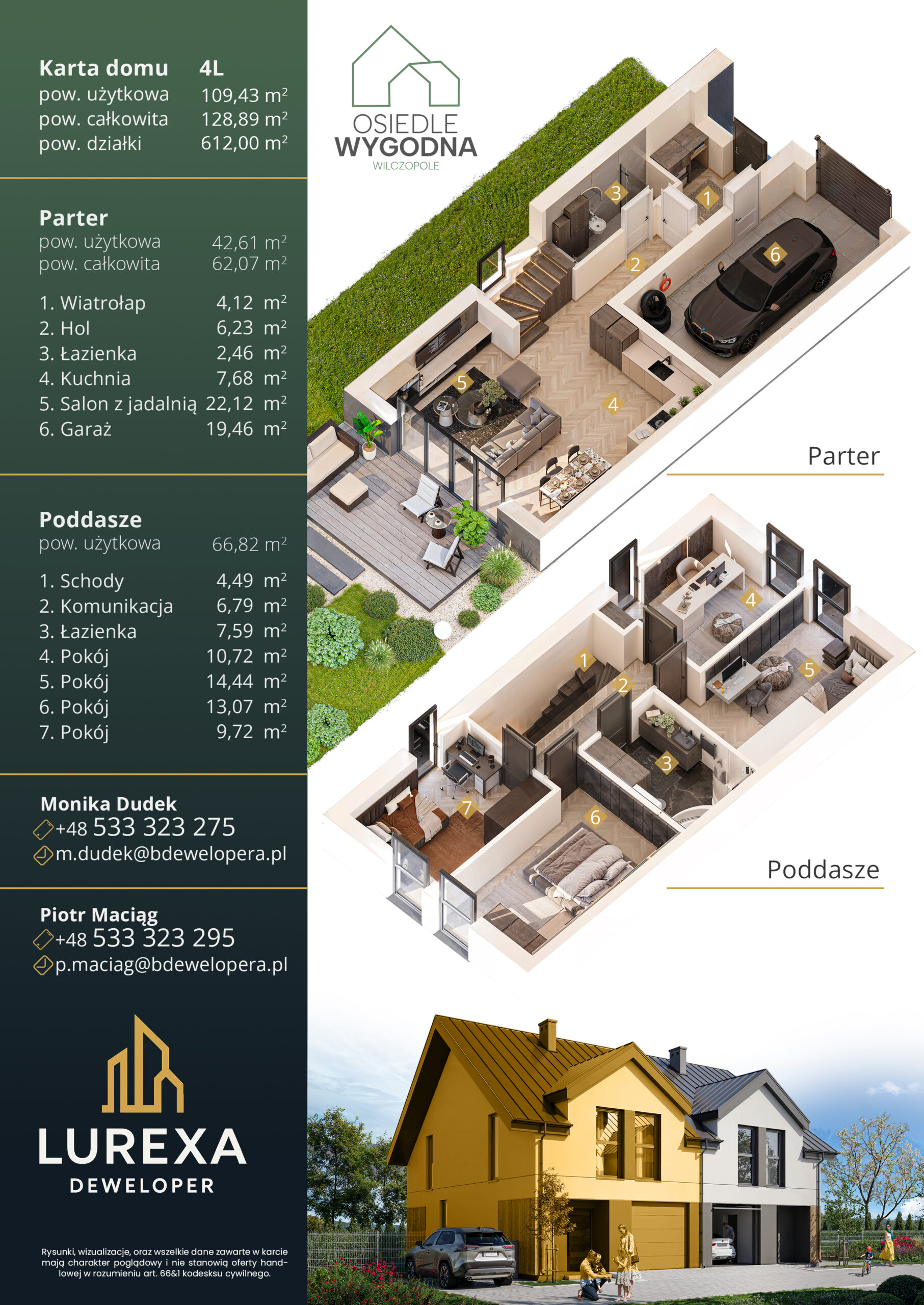 Inwestycja to 2 budynki dwulokalowe o powierzchni 128,89 m² na działkach od 609 do 612 m². Przestronny, komfortowy układ pomieszczeń, garaż w bryle budynku, prywatny ogródek.